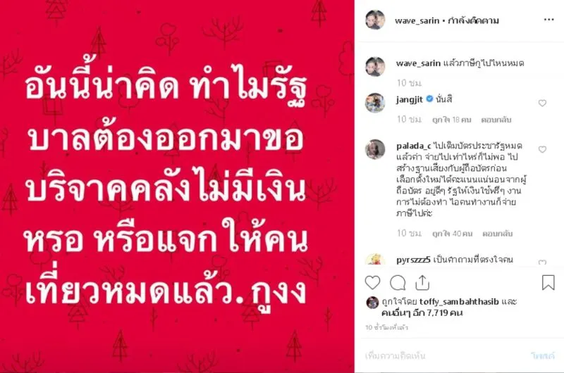 ทนไม่ไหว เวฟ สาริน ถึงกับลั่น แล้วภาษีไปไหนหมด รัฐบาลมาขอรับบริจาค ชาวเน็ตแห่คอมเมนต์สนั่น