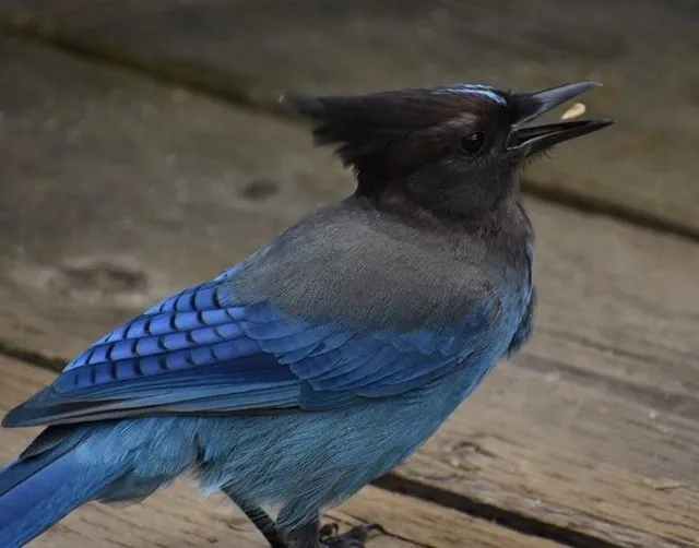 ภาพของนก Steller’s Jay สุดเท่ที่ดูเหมือนกำลังกินอาหารที่ลอยอยู่กลางอากาศ เนื่องจากช่างภาพสามารถถ่ายภาพเอาไว้ได้ขณะที่มันกำลังอ้าปากงับอาหารพอดี