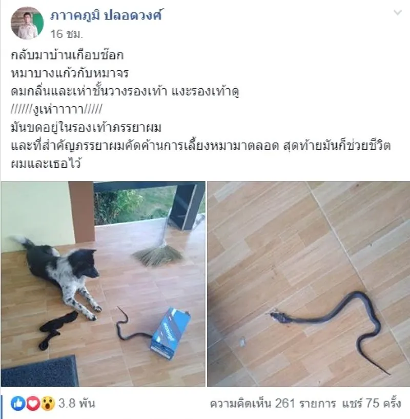 ซึ่งเขาได้เขียนบรรยายเนื้อหาพร้อมโพสต์รูปภาพเอาไว้ว่า กลับมาบ้านเกือบช็อก หมาบางแก้วกับหมาจร ดมกลิ่นและเห่าชั้นวางรองเท้า แงะรองเท้าดู งูเห่าาาาา