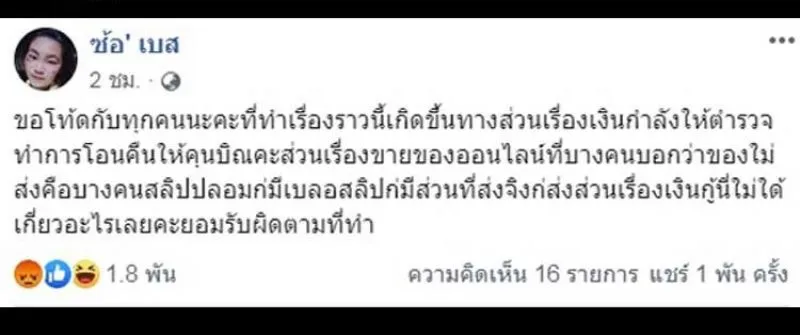 ขอโทษกับทุกคนนะคะที่ทำเรื่องราวนี้เกิดขึ้น ทางส่วนเรื่องเงินกำลังให้ตำรวจทำการโอนคืนให้คุณบิณฑ์ค่ะ ส่วนเรื่องขายของออนไลน์ที่บางคนบอกว่าของไม่ส่ง คือบางคนสลิปปลอมก็มีเบลอสลิปก็มี ส่วนที่ส่งจริงก็ส่ง ส่วนเรื่องเงินกู้นี่ไม่ได้เกี่ยวอะไรเลยค่ะ ยอมรับผิดตามที่ทำ