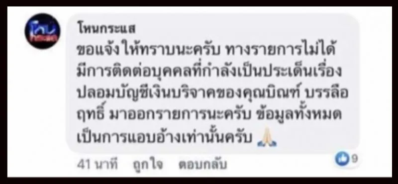 โดยทางรายการได้เข้ามาคอมเมนท์ว่า แจ้งให้ทราบนะครับ ทางรายการไม่ได้มีการติดต่อบุคคลที่กำลังเป็นประเด็นเรื่องปลอมบัญชีเงินบริจาคของคุณบิณฑ์ บรรลือฤทธิ์ มาออกรายการนะครับ ข้อมูลทั้งหมดเป็นการแอบอ้างเท่านั้นครับ