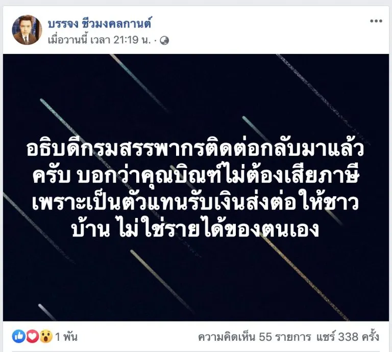“อธิบดีกรมสรรพากรติดต่อกลับมาแล้วครับ บอกว่าคุณบิณฑ์ไม่ต้องเสียภาษีเพราะเป็นตัวแทนรับเงินส่งต่อให้ชาวบ้าน ไม่ใช่รายได้ของตนเอง” ชัดเจนแล้วล่ะค่ะ ว่าคุณบิณฑ์ ไม่ต้องถูกส่งข้อมูลเพื่อพิจารณาเสียภาษี ซึ่งก็ทำให้ประชาชนสบายใจมากขึ้น เพราะฮีโร่ของเราไม่ต้องไปรับภาระจากความเสียสละของเขาเอง