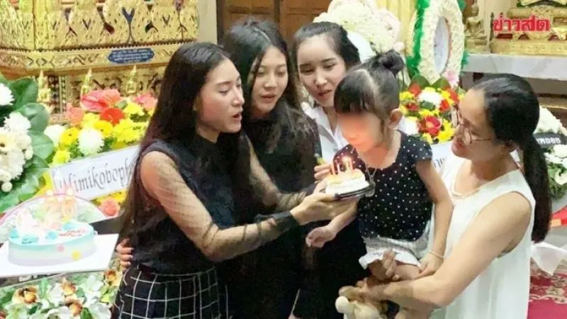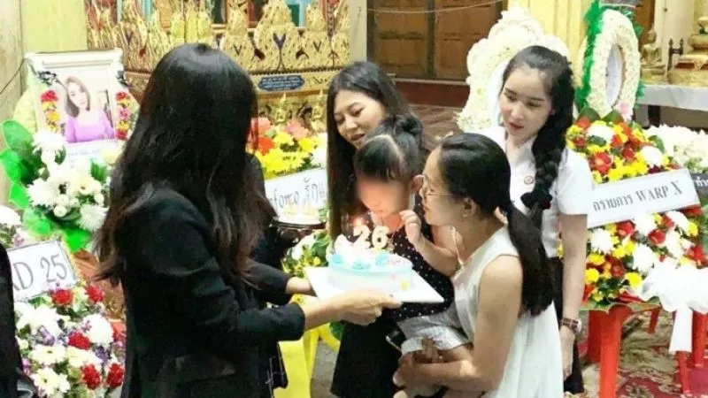 นอกจากนั้นวันนี้ ครอบครัวพร้อมด้วยเพื่อนๆพริตตี้ ยังได้นำเค้กครอบรอบวันเกิด อายุ 26 ปี โดยให้ น้องแบมแบม ลูกสาววัย 3 ขวบของลัลลาเบล ร่วมร้องเพลงแฮปปี้เบิร์ธเดย์ ให้กับแม่ด้วย ท่ามกลางความสะเทือนใจของทุกๆคนที่อยู่ภายในศาลาวัด