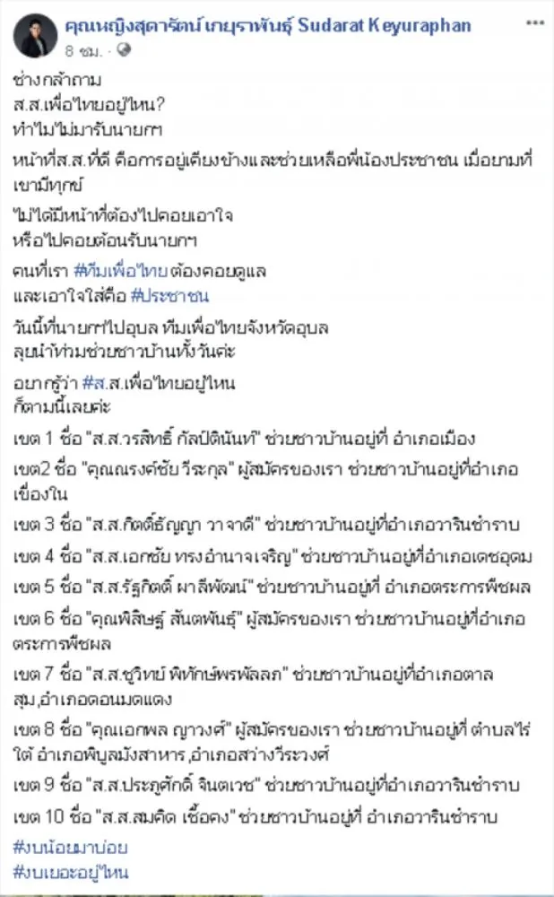จนกระทั้ง คุณหญิงสุดารัตน์ เกยุราพันธุ์ โพสต์ข้อความผ่านเพจเฟซบุ๊กระบุว่า ช่างกล้าถาม ส.ส.เพื่อไทยอยู่ไหน ทำไมไม่มารับนายกฯ หน้าที่ส.ส.ที่ดี คือการอยู่เคียงข้างและช่วยเหลือพี่น้องประชาชน เมื่อยามที่เขามีทุกข์ ไม่ได้มีหน้าที่ต้องไปคอยเอาใจ หรือไปคอยต้อนรับนายกฯ คนที่เรา #ทีมเพื่อไทย ต้องคอยดูแล และเอาใจใส่คือ #ประชาชนวันนี้ที่นายกฯไปอุบล ทีมเพื่อไทยจังหวัดอุบลฯ ลุยน้ำท่วมช่วยชาวบ้านทั้งวันค่ะ