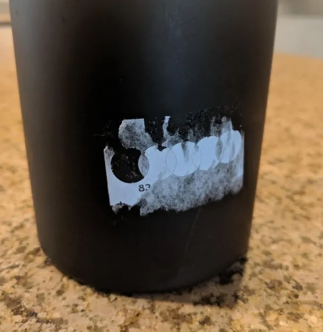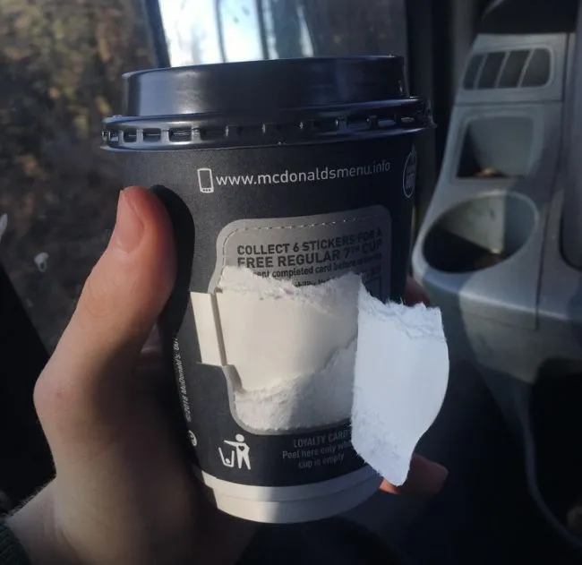2 พยายามแกะป้ายที่เขียนไว้ว่าสะสมครบเท่าไรแล้วจะได้กาแฟฟรีหนึ่งแก้ว แต่ระหว่างการแกะ… มันขาดไปเสียแล้ว