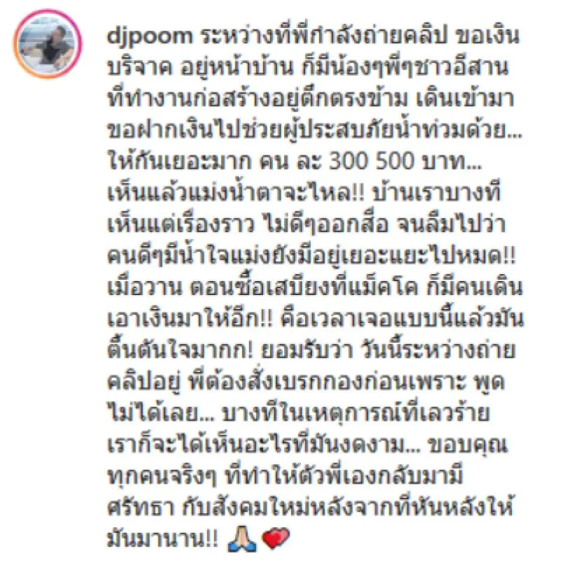 สถานการณ์น้ำท่วมในหลายๆพื้นที่ในจังหวัดอุบลฯ ซึ่งได้รับผลกระทบหนักสุด จนทำให้พี่น้องชาวอุบลได้รับผลกระทบเป็นอย่างมาก จึงทำให้ได้เห็นน้ำใจจากคนไทยทั่วทุกสารทิศได้ร่วมกันบริจาคและช่วยเหลือพี่น้องที่ประสบอุทกภัยในครั้งนี้ มีทั้งคนในวงการบันเทิง หน่วยงานต่างๆและประชาชนที่ร่วมกันช่วยบริจาคสิ่งของและเงินเพื่อช่วยเหลือด้วย ล่าสุดได้มีเรื่องราวดีๆเกิดขึ้ินเมื่อ ดีเจภูมิได้ไปเจอกับคนงานก่อสร้างชาวอีสาน ซึ่งกำลังทำงานอยู่ที่หน้าออฟฟิศของตน โดยคนงานได้เห็นดีเจภูมิ จึงได้ฝากเงินจำนวนหนึ่งเพื่อสมทบทุนช่วยเหลือพี่น้องชาวอุบล ทำเอาดีเจภูมิถึงกับปลื้มปิติสุดๆ โดยดีเจภูมิได้อธิบายว่า