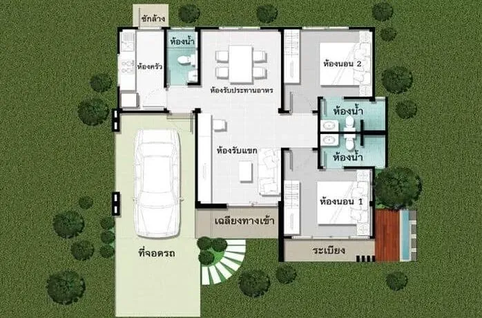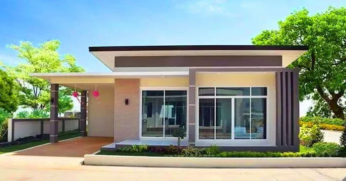 บ้านชั้นเดียว 2 ห้องนอน 2 ห้องน้ำ สไตล์โมเดิร์น เหมาะกับครอบครัวขนาดปานกลาง ซึ่งบ้านทรงโมเดิร์น เป็นที่นิยมอย่างมาก ในปัจจุบัน เพราะมีรูปแบบที่สวยงาม และทันสมัย มาดูกันเลยครับ บริเวณรอบบ้าน มีการตกแต่งด้วยสวนหย่อม ขนาดเล็กๆ หลากหลายด้วยพันธุ์พืช ซึ่งหากมองดูแล้ว ทำให้ตัวบ้านดูเด่น ขึ้นมาทันที