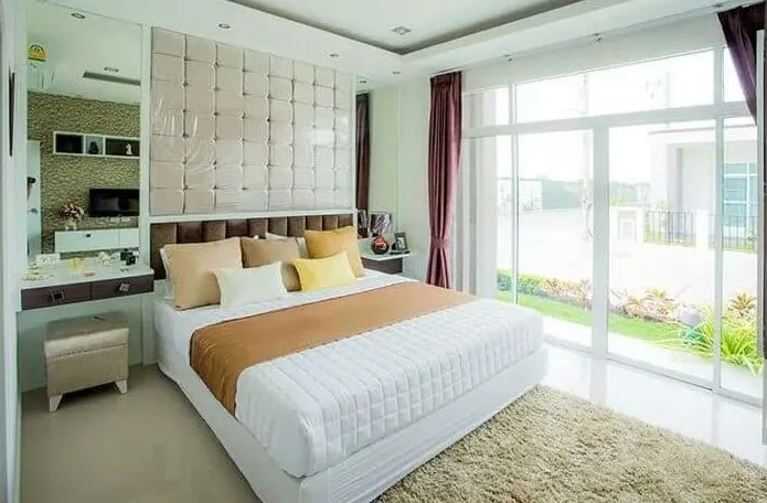 ในส่วนของห้องนอนก็ตกแต่งได้อย่างลงตัวกันเลยทีเดียวครับ จุดเด่นเลยครับ คือผนังบุนวม ซึ่งบ้านหลายๆ หลังไม่มีเหมือนหลังนี้ ส่วนของผนังด้านข้าง ก็ใช้เป็นกระจกแบบใส มีผ้าม่านเป็นส่วนในการปิดกั้น สามารถเปิดออกไปสู่ด้านนอกซึ่งดูเป็นเอกลักษณ์ ของบ้านหลังนี้เลย
