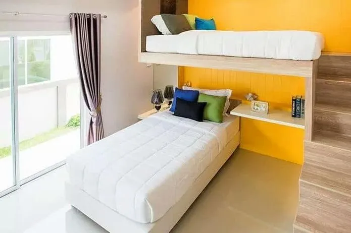 ส่วนของห้องนอนอีกห้อง ออกแบบได้เก๋ มากเลยครับ สามารถใช้พื้นที่ ทำเป็นที่นอนได้สองที่ ซึ่งหากดูจากภาพ ผู้ออกแบบห้องนี้ มีแนวความคิด ที่ดีมาก ส่วนของการตกแต่ง ก็ลงตัวได้เป็นอย่างดี จะเห็นได้ว่าห้องนอนห้องนี้ จะทาสีผนังอีกด้านด้วยสีเหลือง