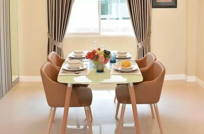 มาต่อกันที่ห้องรับแขกหรือห้องรับประทานอาหารกันเลยครับ ซึ่งเป็นอีกห้องที่สำคัญสำหรับบ้านหลายๆ มีโต๊ะรับประทานอาหาร ตกแต่งด้วยแจกันดอกไม้ เพิ่มความสวยงามและสร้างบรรยากาศที่ดี ในการรับประทานอาหาร มีหน้าต่าง ตรงจุดกับที่โต๊ะรับประทานอาหาร