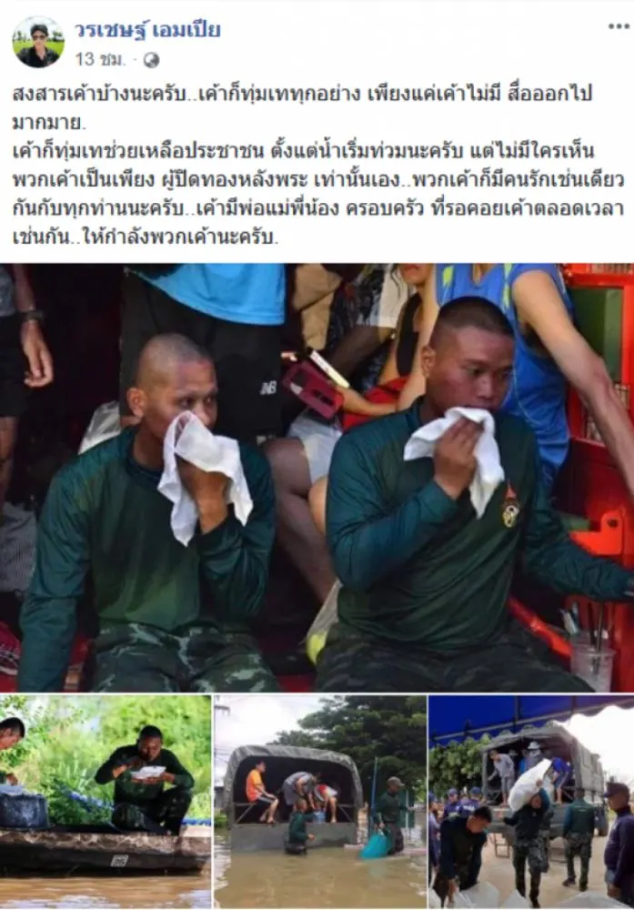 วันที่ 20 กันยายน 2562 ผู้สื่อข่าวสยามนิวส์รายงานว่า ผู้ใช้เฟซบุ๊กชื่อ วรเชษฐ์ เอมเปีย ได้โพสต์ภาพของเหล่าทหารที่เข้าช่วยน้ำท่วมพร้อมระบุข้อความว่า สงสารเค้าบ้างนะครับ..เค้าก็ทุ่มเททุกอย่าง เพียงแค่เค้าไม่มี สื่อออกไปมากมาย. เค้าก็ทุ่มเทช่วยเหลือประชาชน ตั้งแต่น้ำเริ่มท่วมนะครับ แต่ไม่มีใครเห็น พวกเค้าเป็นเพียง ผู้ปิดทองหลังพระ เท่านั้นเอง..พวกเค้าก็มีคนรักเช่นเดียวกันกับทุกท่านนะครับ..เค้ามีพ่อแม่พี่น้อง ครอบครัว ที่รอคอยเค้าตลอดเวลาเช่นกัน..ให้กำลังพวกเค้านะครับ