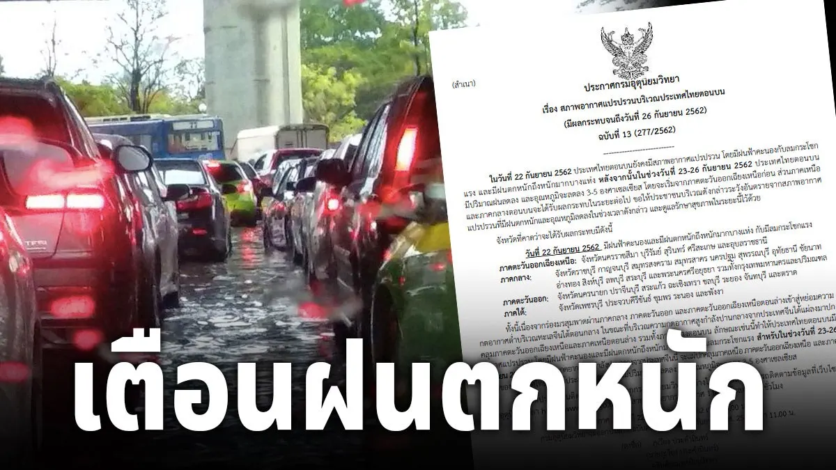 - วันที่ 22 ก.ย.2562 มีฝนฟ้าคะนองและมีฝนตกหนักถึงหนักมากบางแห่งกับมีลมกระโชกแรง ที่ภาคตะวันออกเฉียงเหนือ บริเวณ จ.นครราชสีมา จ.บุรีรัมย์ จ.สุรินทร์ จ.ศรีสะเกษ และ จ.อุบลราชธานี, ภาคกลาง บริเวณ จ.ราชบุรี จ.กาญจนบุรี จ.สมุทรสงคราม จ.สมุทรสาคร จ.นครปฐม จ.สุพรรณบุรี จ.อุทัยธานี จ.ชัยนาท จ.อ่างทอง จ.สิงห์บุรี จ.ลพบุรี จ.สระบุรี และ จ.พระนครศรีอยุธยา รวมทั้งกรุงเทพมหานครและปริมณฑล, ภาคตะวันออก บริเวณ จ.นครนายก จ.ปราจีนบุรี จ.สระแก้ว จ.ฉะเชิงเทรา จ.ชลบุรี จ.ระยอง จ.จันทบุรี จ.ตราด, ภาคใต้ บริเวณ จ.เพชรบุรี จ.ประจวบคีรีขันธ์ จ.ชุมพร จ.ระนอง และ จ.พังงา