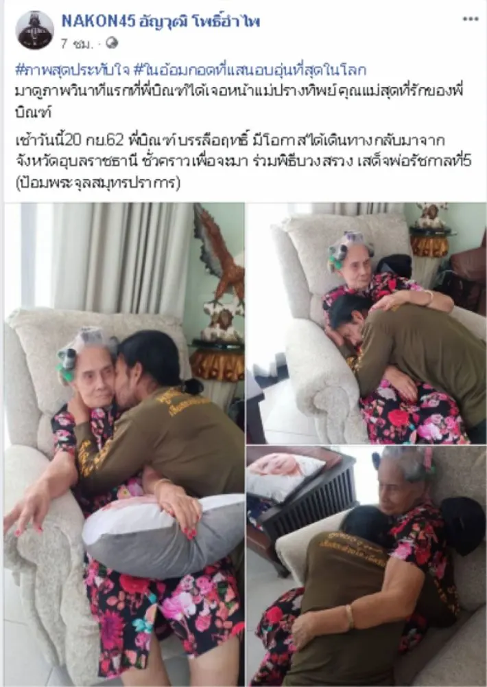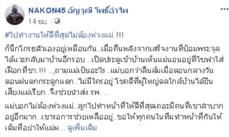 แม่บอกไม่ต้องห่วงแม่..ลูกไปทำหน้าที่ให้ดีที่สุดเถอะมีคนที่เขาลำบากอยู่อีกมาก..เขารอการช่วยเหลืออยู่..ขอให้ทุกคนในทีมทำหน้าที่กันให้เต็มที่อย่าให้แม่ผิดหวัง ..ส่วนแม่ดูแลตัวเองได้แม่ก็อยู่ที่บ้านนี่แหละ..เสร็จงานแล้วให้รีบกลับมาบ้านน่ะ.