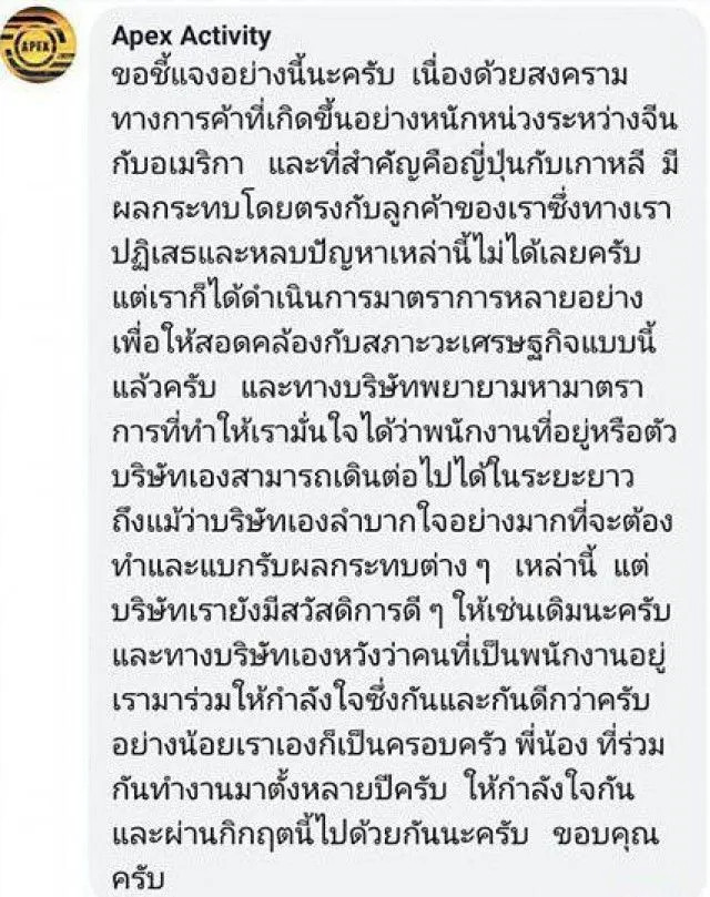 อย่างไรก็ตาม ต่อมาทางเพจ Apex Activity ซึ่งเป็นของทางบริษัท เอเพ็กซ์ เซอร์คิต (ไทยแลนด์) จำกัด ได้เข้ามาโพสต์ชี้แจงในเฟซบุ๊ก หนุ่มสาวชาวโรงงาน ระบุว่า จากเหตุการณ์ที่เกิดขึ้น ทางบริษัทไม่ได้นิ่งนอนใจแต่อย่างใด ได้มีการต่อสู้และใช้มาตรการต่าง ๆ มาเป็นระยะเวลา 3-4 เดือนแล้ว แต่ด้วยในเรื่องของสภาวะเศรษฐกิจโลกส่งผลกระทบโดยตรงกับลูกค้าของบริษัท ซึ่งทางบริษัทเองไม่สามารถหลบเลี่ยงปัญหาเหล่านี้ได้ จึงจำเป็นต้องปรับลดกำลังพนักงานใหม่ที่ยังไม่ผ่านการทดลองงาน ไม่ใช่การปลดหรือจ้างพนักงานเก่าออก ตามที่มีความเข้าใจคลาดเคลื่อน
