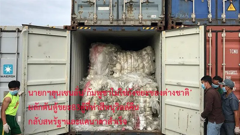 นายกฯฮุนเซนประกาศ'กัมพูชาไม่ใช่ถังขยะของต่างชาติ' สั่งสำนักงานศุลกากร (GDCE) คืนตู้คอนเทนเนอร์บรรจุขยะพลาสติกเน่า 83 ตู้ที่ท่าเรือน้ำลึกสีหนุวิลล์ กลับประเทศต้นทาง สหรัฐอเมริกา 70 ตู้จำนวน 1,322 ตันและแคนาดา 13 ตู้จำนวน 270 ตันสำเร็จ ปรับบริษัทผู้นำเข้าขยะผิดกฏหมาย 1.03 พันล้านเรียล (ราว 7.72 ล้านบาท)