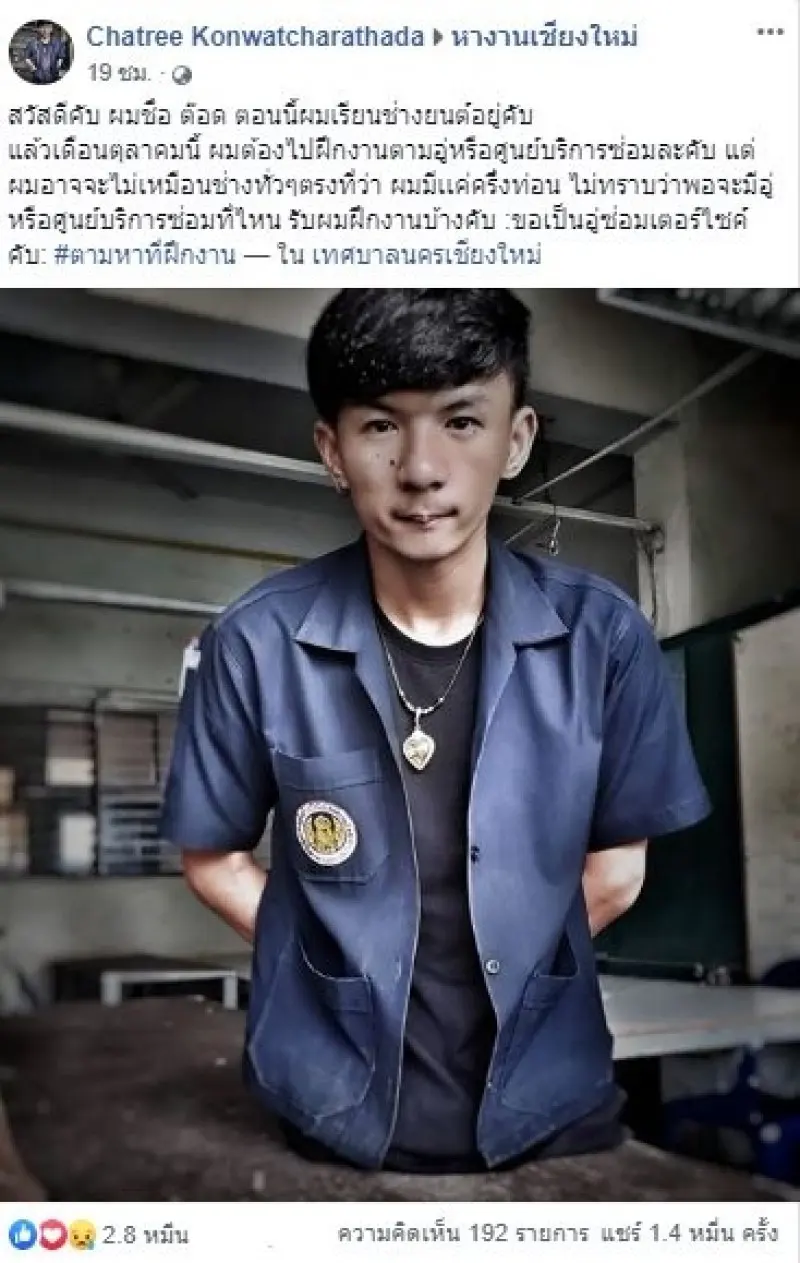 วันที่ 23 กันยายน 2562 โลกโซเชียลมีการแชร์ต่อโพสต์ของ นักศึกษาจากมหาวิทยาลัยแห่งหนึ่งใน จ.เชียงใหม่ ซึ่งเป็นผู้พิการครึ่งท่อน ได้ออกมาโพสต์ข้อความหาสถานที่ฝึกงานผ่านเฟซบุ๊ก จนมีผู้คนเข้ามาแสดงความคิดเห็น ให้กำลังใจหนุ่มคนดังกล่าวเป็นจำนวนมาก มีการแชร์ต่อข้อความของหนุ่มคนดังกล่าวเป็นจำนวนมากนับหมื่นครั้ง โดยโพสต์ดังกล่าว ผู้ใช้เฟซบุ๊กชื่อ Chatree Konwatcharathada ได้โพสต์ระบุว่า "สวัสดีคับ ผมชื่อ ต๊อด ตอนนี้ผมเรียนช่างยนต์อยู่คับ แล้วเดือนตุลาคมนี้ ผมต้องไปฝึกงานตามอู่หรือศูนย์บริการซ่อมละคับ แต่ผมอาจจะไม่เหมือนช่างทั่วๆไปตรงที่ว่า ผมมีเเค่ครึ่งท่อน ไม่ทราบว่าพอจะมีอู่หรือศูนย์บริการซ่อมที่ไหนรับผมฝึกงานบ้างคับ ขอเป็นอู่ซ่อมเตอร์ไซค์คับ" #ตามหาที่ฝึกงาน