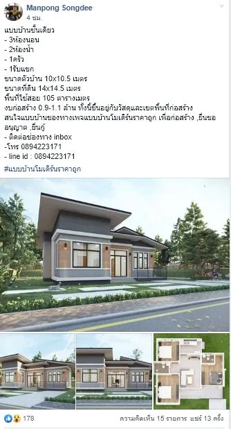โดยคุณ Manpong Songdee ได้ทิ้งรายละเอียดสำหรับผู้ที่สนใจดังกล่าวว่า “ถ้าสนใจแบบบ้านของทางเพจแบบบ้านโมเดิร์นราคาถูก เพื่อก่อสร้าง,ยื่นขออนุญาต,ยื่นกู้ ก็สามารถติดต่อได้ช่องทาง inbox หรือหมายเลขโทรศัพท์ 0894223171 และ line id 0894223171 ได้เลยครับ สำหรับแบบบ้านพร้อมก่อสร้าง + รายการประมาณราคา BOQ = 5,000 บาทครับ