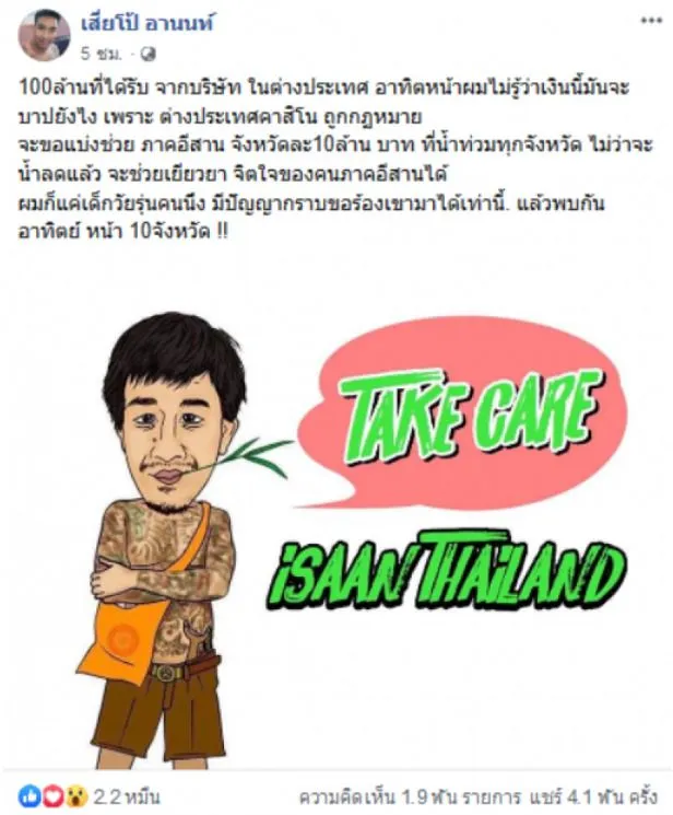 100 ล้านที่ได้รับ จากบริษัทในต่างประเทศ อาทิตย์หน้าผมไม่รู้ว่าเงินนี้มันจะบาปยังไง เพราะต่างประเทศ ถูกกฏหมาย จะขอแบ่งช่วย ภาคอีสาน จังหวัดละ 10 ล้านบาท ที่น้ำท่วมทุกจังหวัด ไม่ว่าจะน้ำลดแล้ว จะช่วยจิตใจของคนภาคอีสานได้ ผมก็แค่เด็กวัยรุ่นคนหนึ่ง มีปัญญากราบขอร้องเขามาได้เท่านี้ แล้วพบกันอาทิตย์หน้า 10จังหวัด