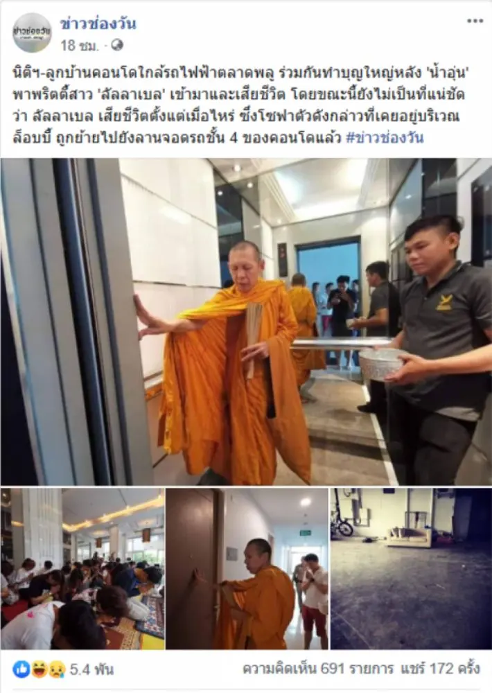 วันที่ 24 กันยายน 2562 ผู้สื่อข่าวรายงานว่า วานนี้ผู้ใช้เพจเฟซบุ๊กชื่อ ข่าวช่องวัน ได้โพสต์ภาพของพระที่มาทำบุญโดยระบุข้อความว่า นิติฯ-ลูกบ้านคอนโดใกล้รถไฟฟ้าตลาดพลู ร่วมกันทำบุญใหญ่หลัง 'น้ำอุ่น' พาพริตตี้สาว 'ลัลลาเบล' เข้ามาและเสียชีวิต โดยขณะนี้ยังไม่เป็นที่แน่ชัดว่า ลัลลาเบล เสียชีวิตตั้งแต่เมื่อไหร่ ซึ่งโซฟาตัวดังกล่าวที่เคยอยู่บริเวณล็อบบี้ ถูกย้ายไปยังลานจอดรถชั้น 4 ของคอนโดแล้ว