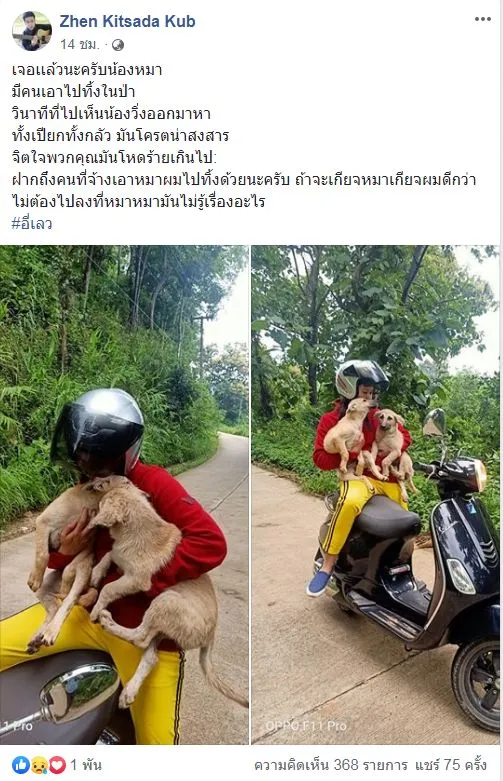 “เจอแล้วนะครับน้องหมามีคนเอาไปทิ้งในป่าวินาทีที่ไปเห็นน้องวิ่งออกมาหาทั้งเปียกทั้งกลัว มันโคตรน่าสงสารจิตใจพวกคุณมัน ฝากถึงคนที่จ้างเอาหมาผมไปทิ้งด้วยนะครับ ถ้าจะเกลียดหมาเกลียดผมดีกว่าไม่ต้องไปลงที่หมาหมามันไม่รู้เรื่องอะไร ”