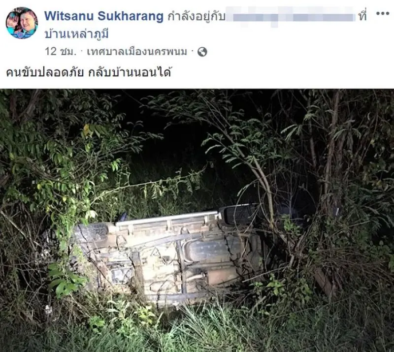 เมื่อวานนี้ 24 กันยายน 2562 มีรายงานว่า อาสาสมัครกู้ภัยนครพนม ผู้ใช้เฟซบุ๊ก Witsanu Sukharang ได้มีการรายงานเหตุรถยนต์พลิกคว่ำตกข้างทาง เหตุเกิดบริเวณ บ.เหล่าภูมี ต.หนองญาติ อ.เมืองนครพนม ซึ่งหลังเจ้าหน้าที่กู้ภัยได้รับแจ้งก็ได้เดินทางไปยังจุดเกิดเหตุ พบเพียงรถยนต์ที่อยู่ในสภาพพลิกตะแคงอยู่ในป่าริมทาง