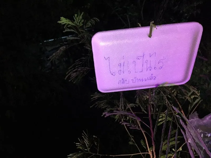 แต่พอลงไปดูจุดเกิดเหตุใกล้ๆกลับพบข้อความที่ถูกเขียนด้วยปากกาลงบนกล่องโฟม ถูกปักไว้ที่กิ่งไม้ ระบุข้อความว่า