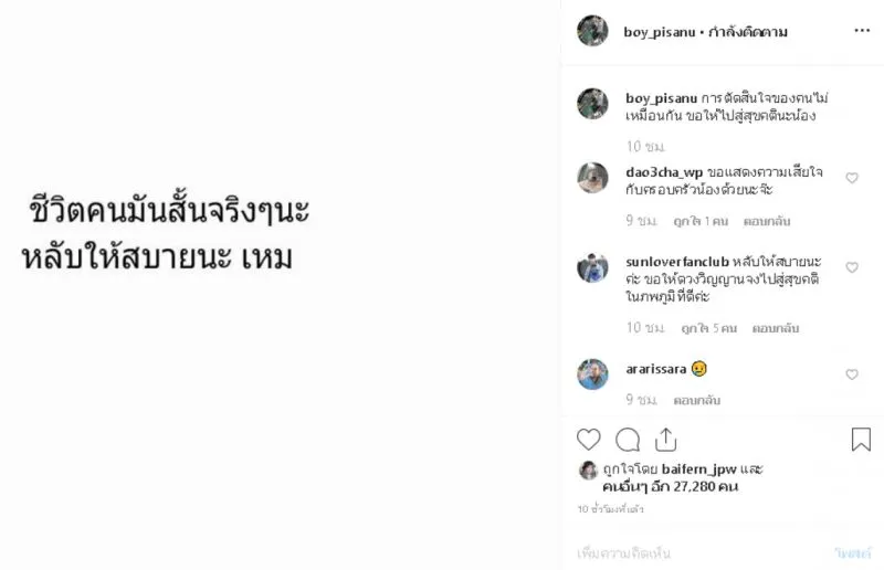 ล่าสุด ทางด้านหนุ่ม บอย af หรือ บอย พิษณุ ได้โพสต์อินสตาแกรม ถึงน้องชาย เหม ระบุข้อความว่า การตัดสินใจของคนไม่เหมือนกัน ขอให้ไปสู่สุขคตินะน้อง