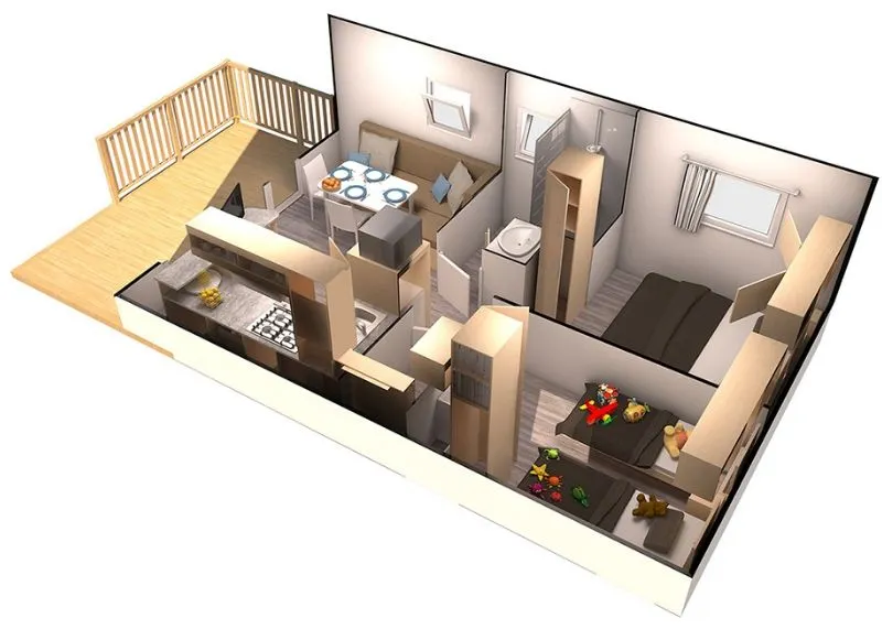 ภายในบ้านถูกจัดเป็นสัดส่วน อย่างเหมาะสม ประกอบไปด้วย ห้องนอน ห้องรับแขก ห้องครัว ห้องน้ำ ผู้เขียนคิดว่าเป็นการวางแบบได้อย่างมีระบบ ชอบมากๆ ครับ พูดแล้วก็อยากได้สักหลัง สังเกตุได้ครับว่าบ้านหลังนี้ถึงแม้จะเป็นบ้านโมบายหลังเล็กๆ แต่ว่าจัดแบบได้อย่างครบครัน อาศัยได้อย่างมีความสุข ไม่ต่างจากบ้านหลังใหญ่เลยล่ะ