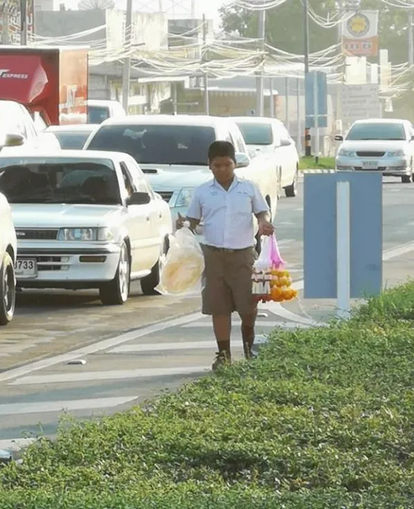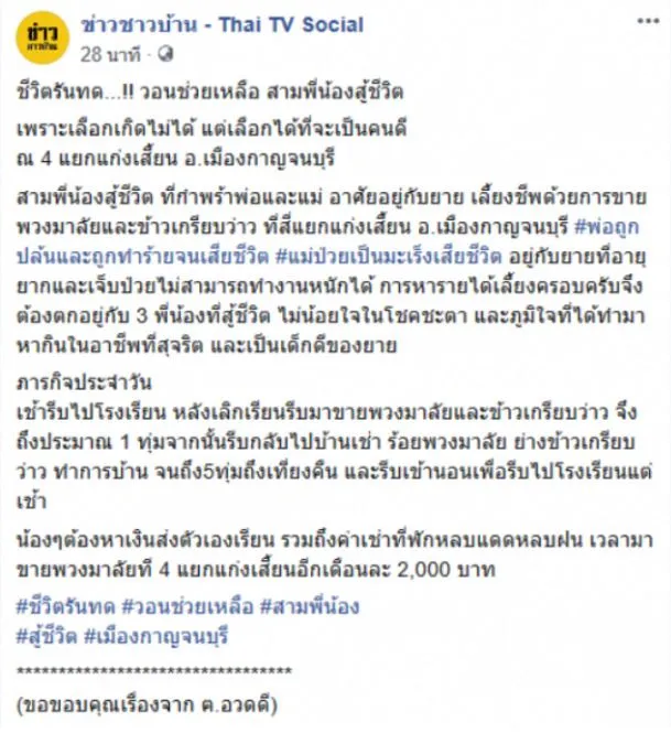“ชีวิตรันทด วอนช่วยเหลือ สามพี่น้องสู้ชีวิต เพราะเลือกเกิดไม่ได้ แต่เลือกได้ที่จะเป็นคนดี ณ 4 แยกแก่งเสี้ยน อ.เมืองกาญจนบุรี สามพี่น้องสู้ชีวิต ที่กำพร้าพ่อและแม่ เลี้ยงชีพด้วยการขายพวงมาลัยและข้าวเกรียบ