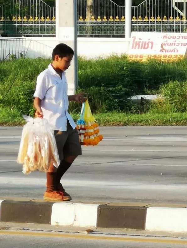 น้องๆต้องหาเงินส่งตัวเองเรียน รวมถึงค่าเช่าที่พักหลบแดดหลบฝน เวลามาขายพวงมาลัยที่ 4 แยกแก่งเสี้ยนอีกเดือนละ 2,000 บ.”