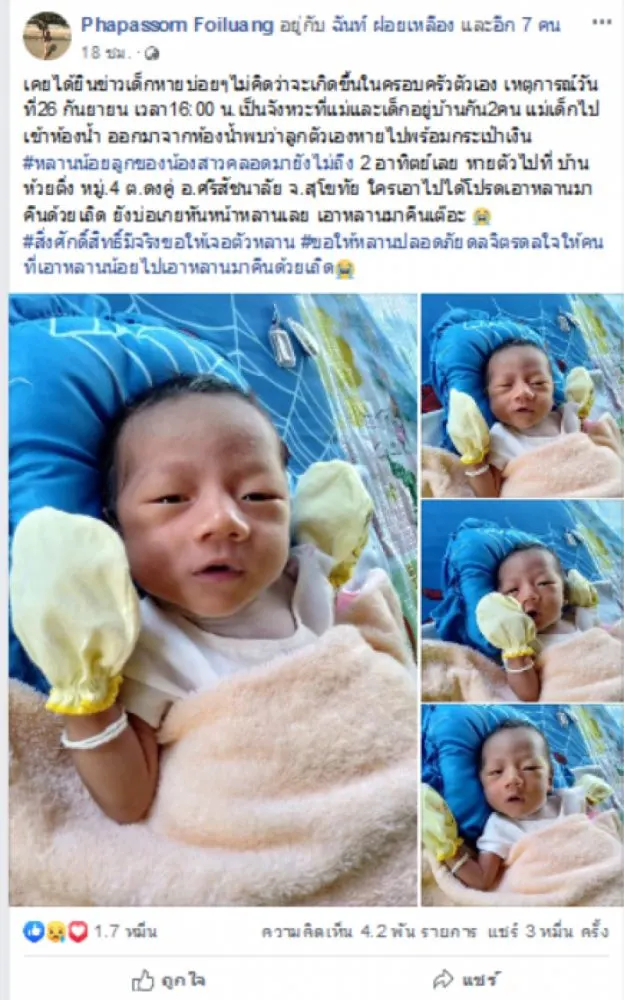 เคยได้ยินข่าวเด็กหายบ่อยๆไม่คิดว่าจะเกิดขึ้นในครอบครัวตัวเอง เหตุการณ์วันที่26 กันยายน เวลา16:00 น.เป็นจังหวะที่แม่และเด็กอยู่บ้านกัน2คน แม่เด็กไปเข้าห้องน้ำ ออกมาจากห้องน้ำพบว่าลูกตัวเองหายไปพร้อมกระเป๋าเงิน หลานน้อยลูกของน้องสาวคลอดมายังไม่ถึง 2 อาทิตย์เลย หายตัวไปที่ บ้านห้วยติ่ง หมู่.4 ต.ดงคู่ อ.ศรีสัชนาลัย จ.สุโขทัย ใครเอาไปได้โปรดเอาหลานมาคืนด้วยเถิด ยังบ่อเกยหันหน้าหลานเลย เอาหลานมาคืนเต๊อะ สิ่งศักดิ์สิทธิ์มีจริงขอให้เจอตัวหลาน #ขอให้หลานปลอดภัยดลจิตรดลใจให้คนที่เอาหลานน้อยไปเอาหลานมาคืนด้วยเถิด