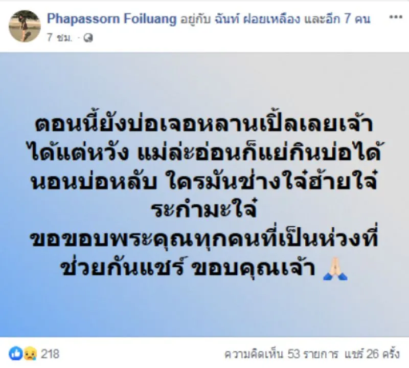 ล่าสุด Phapassorn Foiluang โพสต์ข้อความระบุว่า ขออนุญาตปิดคอมเม้น เราเป็นป้าของเด็กเองคุณปัญญาอ่อนเกินไป ใครจะเอาเรื่องที่ไม่จริงมาโพสต์เล่นกัน ชีวิตเด็กน้อยทั้งชีวิตนะ ขอขอบคุณทุกคนที่ช่วยกันแชร์ ข่าวไปไวมาก และเสียใจที่ยังมีคนประเภทนี้อยู่ เสียใจจริงๆ