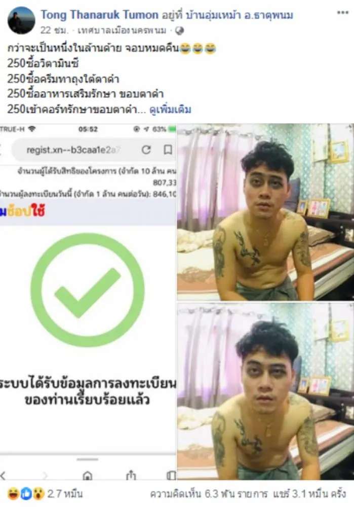 เรียกได้ว่าเป็นเรื่องราวที่มีคนแห่แชร์เรื่องราวกันเป็นจำนวนมาก สำหรับโครงการชิม ช๊อป ใช้ ที่ตอนนี้มีคนลงทะเบียนเต็มทุกวัน และต้องบอกเลยว่าใครที่ลงทะเบียนนั้นจะรู้ดีว่ากว่าจะลงได้ต้องยอกเย็นเบอร์ไหน โดยผู้ใช้เฟสบุ๊คที่ใช้ชื่อว่า Tong Thanaruk Tumon ได้โพสต์ผ่านเฟสบุ๊ค โดยหนุ่มรายนี้ก็ได้เป็นหนึ่งในบุคคลที่ลงทะเลียนเช่นกัน และต้องบอกเลยว่าต้องเสียอะไรไปเยอะมากกว่าจะได้เป็น1ใน1ล่านคนต่อวัน โดยผู้ใช้เฟสบุ๊ครายนี้ได้โพสต์ระบุข้อความว่า กว่าจะเป็นหนึ่งในล้านด้าย จอบหมดคืน 250ซื้อวิตามินซี 250ซื้อครีมทาถุงใต้ตาดำ 250ซื้ออาหารเสริมรักษา ขอบตาดำ 250เข้าคอร์ทรักษาขอบตาดำ 1000 พอดีครับลุงตูบ