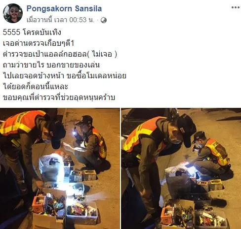 โดยผู้ใช้เฟซบุ๊ก Pongsakorn Sansila ได้เล่าเรื่องราวนี้ไว้ว่า … 5555โครตบันเทิง เจอด่านตรวจเกือบๆตี 1 ตำรวจขอเป่าแอลกอฮอล์ (ไม่เจอ) ถามว่าขายไร บอกขายของเล่น