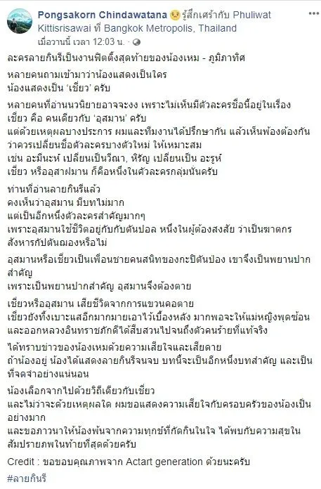 ในเฟซบุ๊ก Pongsakorn Chindawatana โพสต์ข้อความระบุว่า ละครลายกินรีเป็นงานฟิตติ้งสุดท้ายของน้องเหม – ภูมิภาทิศ หลายคนถามเข้ามาว่าน้องแสดงเป็นใครน้องแสดงเป็น ‘เชี่ยว’ ครับ หลายคนที่อ่านนวนิยายอาจจะงง เพราะไม่เห็นมีตัวละครชื่อนี้อยู่ในเรื่องเชี่ยว คือ คนเดียวกับ ‘อุสมาน’ ครับแต่ด้วยเหตุผลบางประการ ผมและทีมงานได้ปรึกษากัน แล้วเห็นพ้องต้องกันว่าควรเปลี่ยนชื่อตัวละครบางตัวใหม่ ให้เหมาะสมเช่น อะมีนะห์ เปลี่ยนเป็นวีณา, หิรัญ เปลี่ยนเป็น อะรูห์เชี่ยว หรืออุสาฝมาน ก็คือหนึ่งในคัวละครกลุ่มนั่นครับ