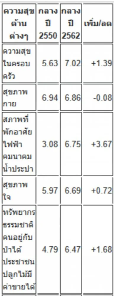 ขณะเดียวกัน คนไทยมีความสุขลดลงในด้านสุขภาพกาย การใช้ชีวิตพอเพียง และความสัมพันธ์ของคนในชาติ