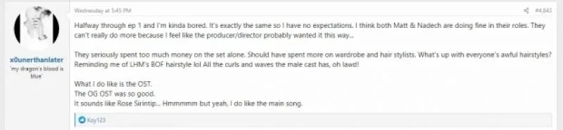 พวกเขาใช้เงินมากเกินไปกับฉาก ควรมีการใช้จ่ายมากขึ้นในคอสตูมและช่างทำผม เกิดอะไรขึ้นกับทรงผมที่น่ากลัวของทุกคน? เตือนให้ฉันนึกถึงทรงผมของ BOF(ซีรี่ส์F4เวอร์ชั่นเกาหลีใต้)ของ อี มินโฮ ฮ่า ๆ นักแสดงชายทุกคนทำผม มันหยิกๆและเป็นคลื่นทั้งหมด