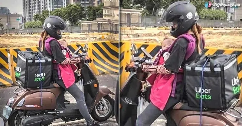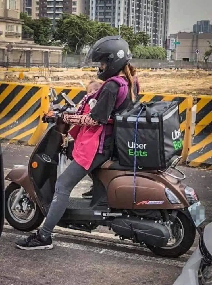 เและเมื่อเร็วๆนี้เองก็มีคนถ่ายภาพ ผู้หญิงคนหนึ่งที่กระเตงลูกไว้ตรงหน้าอก และด้านหลังก็มีกล่องส่งอาหาร ต้องทำงานไปด้วยและเลี้ยงลูกไปด้วย เป็นอะไรที่ลำบากมาก โดยภาพนี้ได้ถูกแชร์มาจากเพจท้องถิ่นของไต้หวัน โดยระบุว่า กระทำนี้เป็นการทำผิดกฎความปลอดภัยการจราจรบนท้องถนน