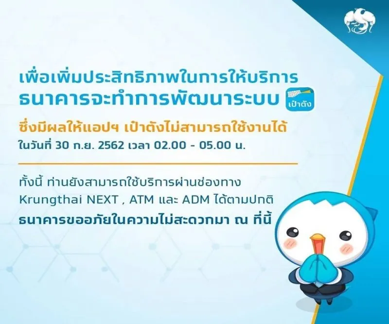 ล่าสุดธนาคารกรุงไทยแจ้งว่าจะทำการพัฒนาระบบ เพื่อเพิ่มประสิทธิภาพการให้บริการ ส่งผลให้แอปฯ เป๋าตังไม่สามารถใช้งานได้ระหว่างเวลา 02.00-05.00 น. ของวันที่ 30 กันยายน 2562 แต่ยังสามารถใช้บริการผ่านช่องทางกรุงไทย NEXT ATM และ ADM ได้ตามปกติ ขออภัยในความไม่สะดวก
