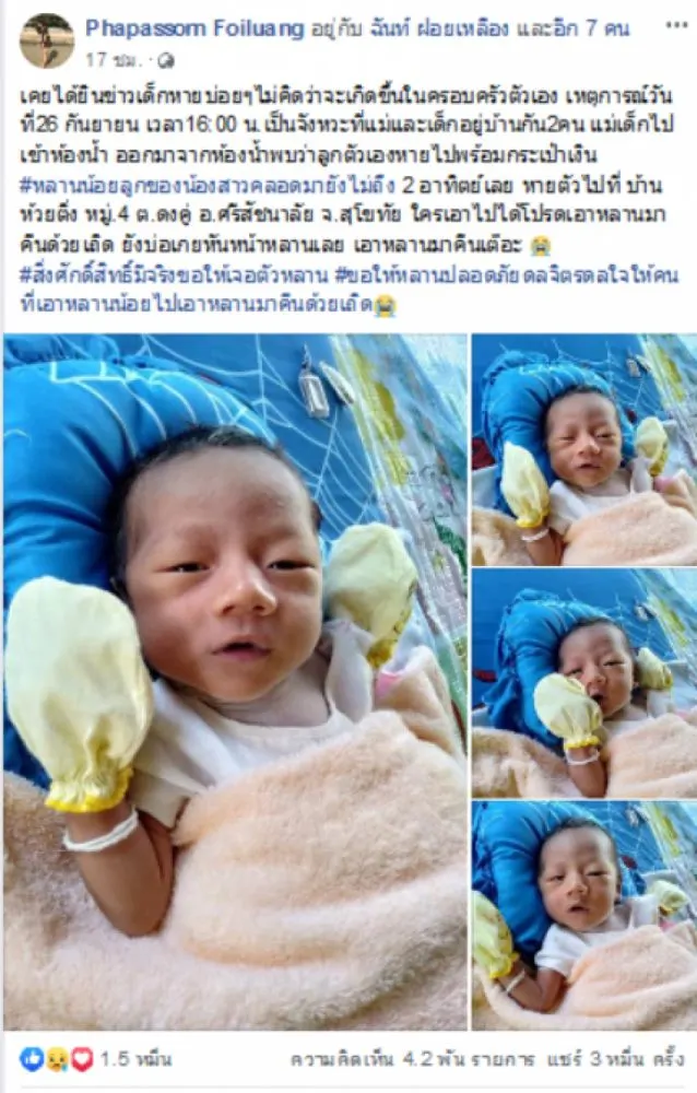 เป็นอีกหนึ่งเรื่องราวที่ชาวเน็ตแห่แชร์ และให้ความสนใจกันเป็นจำนวนมาก หลังมีผู้ใช้เฟสบุ๊ค Phapassorn Foiluang ได้โพสต์ประกาศตามหาตัวหลานถูกอุ้มหายออกไปจากบ้าน พร้อมได้ระบุข้อความว่า เคยได้ยินข่าวเด็กหายบ่อยๆไม่คิดว่าจะเกิดขึ้นในครอบครัวตัวเอง เหตุการณ์วันที่26 กันยายน เวลา16:00 น.เป็นจังหวะที่แม่และเด็กอยู่บ้านกัน2คน แม่เด็กไปเข้าห้องน้ำ ออกมาจากห้องน้ำพบว่าลูกตัวเองหายไปพร้อมกระเป๋าเงิน