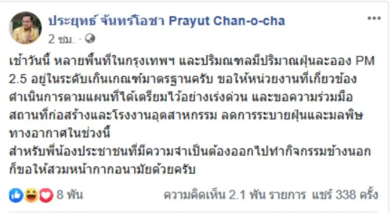 เช้าวันนี้ หลายพื้นที่ในกรุงเทพฯ และปริมณฑลมีปริมาณฝุ่นละออง PM 2.5 อยู่ในระดับเกินเกณฑ์มาตรฐานครับ ขอให้หน่วยงานที่เกี่ยวข้องดำเนินการตามแผนที่ได้เตรียมไว้อย่างเร่งด่วน และขอความร่วมมือสถานที่ก่อสร้างและโรงงานอุตสาหกรรม ลดการระบายฝุ่นและมลพิษทางอากาศในช่วงนี้ สำหรับพี่น้องประชาชนที่มีความจำเป็นต้องออกไปทำกิจกรรมข้างนอกก็ขอให้สวมหน้ากากอนามัยด้วยครับ