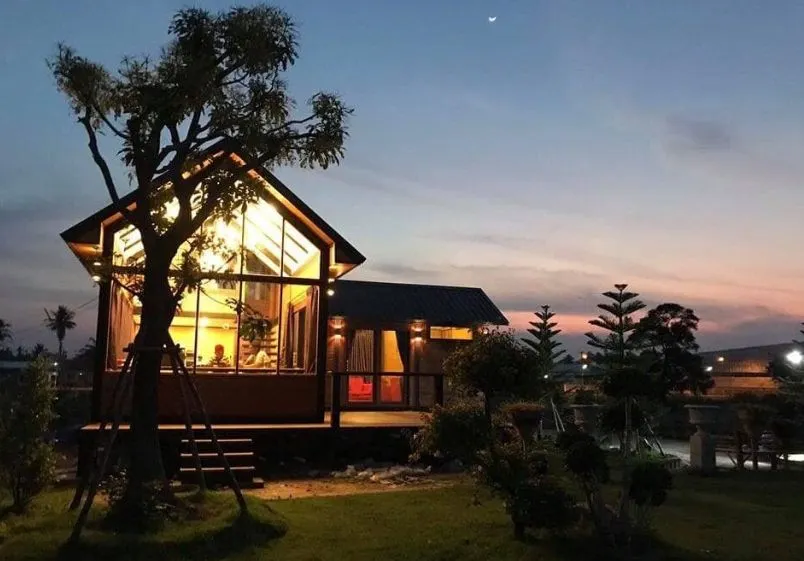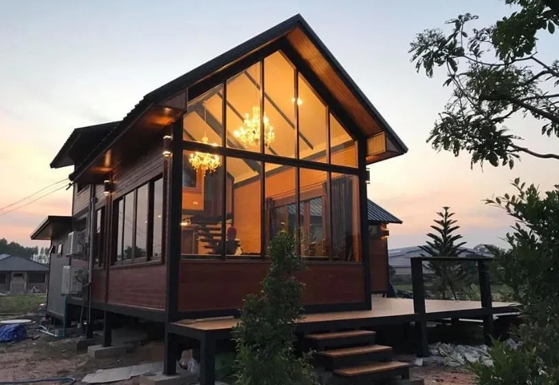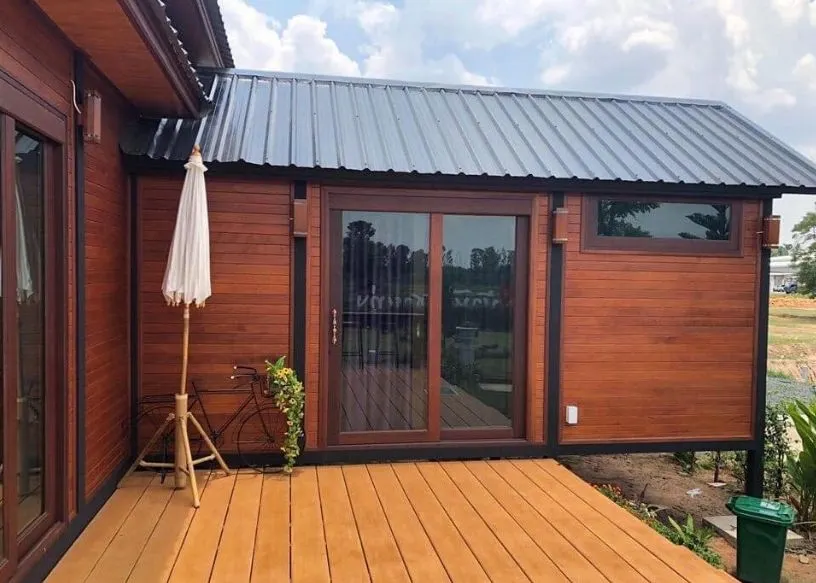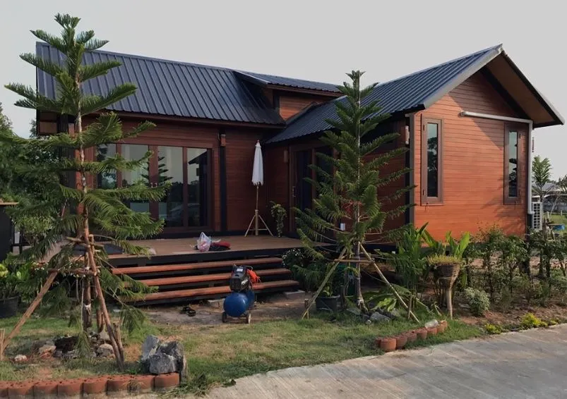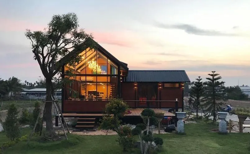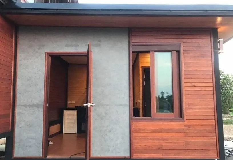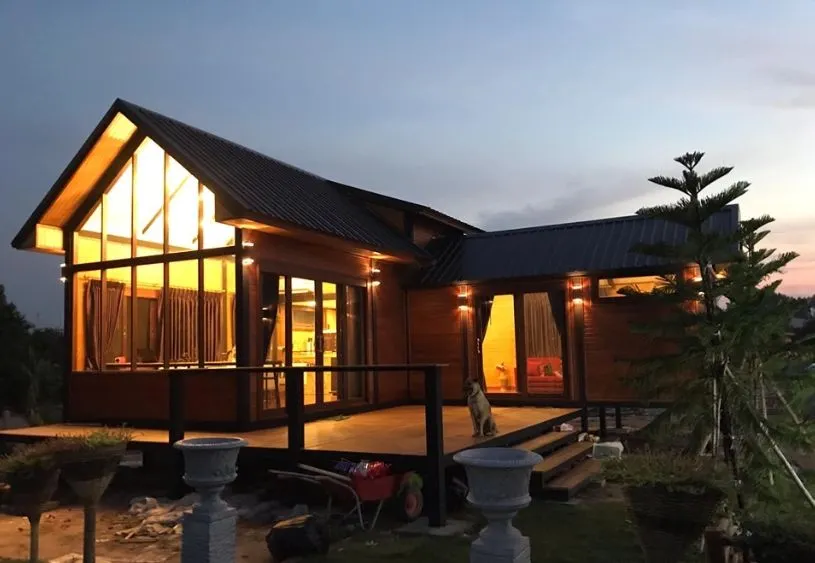 บ้านหลังนี้มี หนึ่งห้องนอน หนึ่งห้องน้ำ และสองห้องรับแขก พร้อมมีอีกหนึ่งห้องครัว โดยมองได้เดินเข้ามาสิ่งแรกที่คุณสัมผัสได้เลยคือ กลิ่นอายของความสงบและโล่งโปร่ง เพราะบริเวณรอบตัวบ้านมีการปลูกต้นไม้ประดับ เพื่อมความร่มรื่นให้กับตัวบ้าน หลังคาของบ้านหลังนี้เลือกคาใช้โทนสีเข้ม โดยเลือกหลังคาแบบเมทัลชีท โครงสร้างของตัวบ้านเป็นเหล็ก ผนังเป็นไม้
