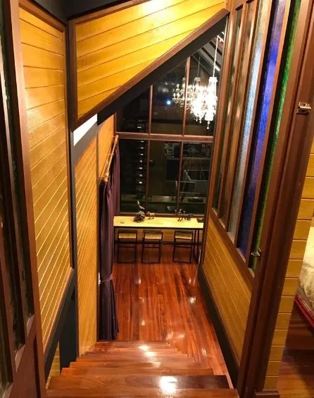 ซึ่งบ้านหลังนี้ นอกจากจะมีจุดเด่น หรือจุดดึงดูดอยู่ที่ระเบียงด้านหน้าแล้ว ภายในบ้านก็ยังมีความโดดเด่น ที่เป็นเอกลักาณะเฉพาะตัวของบ้านทรงน็อคดาวน์อีกด้วย โดยภายในบ้านมีการตกแต่งภายในให้เข้ากับบรรยากาศร้านกาแฟได้อย่างสวยงาม