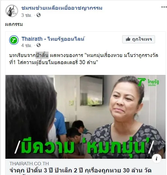 จาก เพจ ชมรมช่วยเหลือเหยื่ออาชญากรรม ได้แชร์ข่าวและโพสต์สั้นๆ ว่า "ผลกรรม" สื่อหลักรายงานว่า..บทเรียนจากป้าติ้น ผลพวงของการ "หมกมุ่นเรื่องหวย มโนว่าถูกรางวัลที่1 ใส่ความผู้อื่นขโมยลอตเตอรี่ 30 ล้าน"