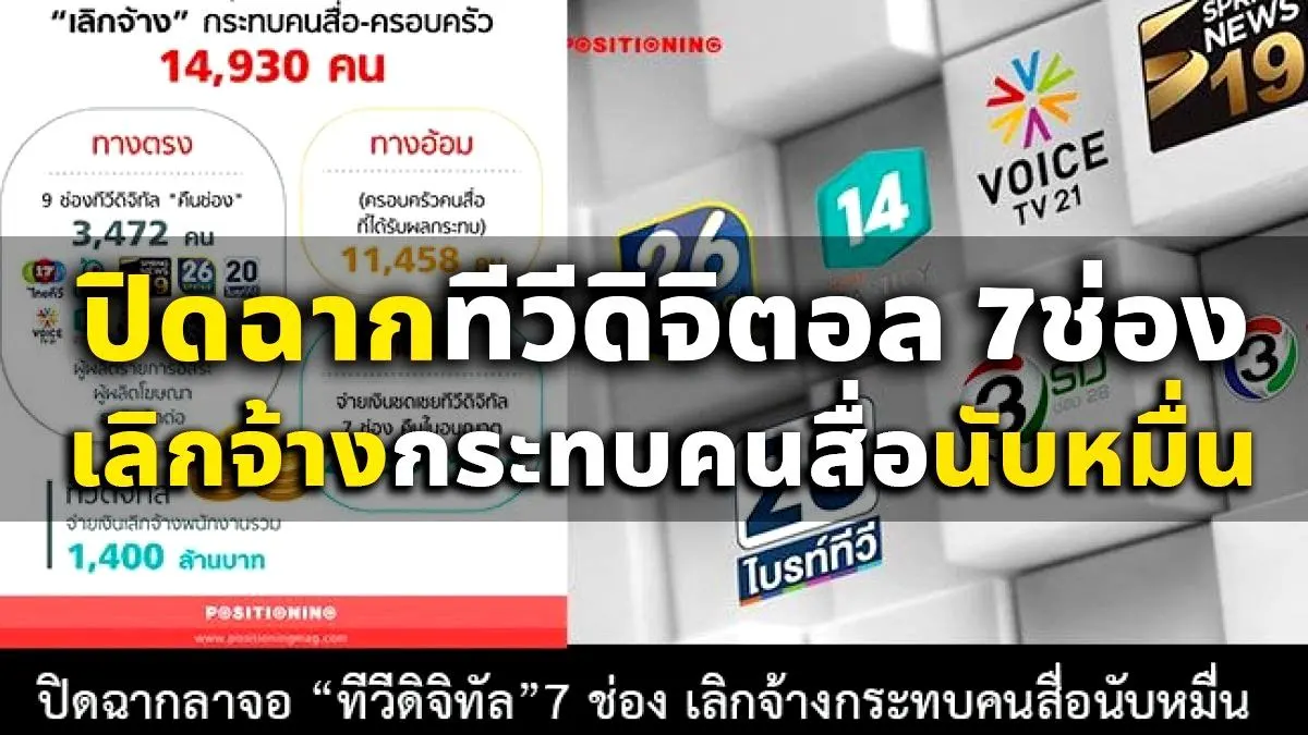 การปิดตัวของทีวีดิจิทัล 9 ช่อง ทั้ง “ไทยทีวีและโลก้า” และ 7 ช่องคืนใบอนุญาต มีพนักงาน “ทางตรง” ที่เป็นพนักงานประจำและส่วนที่เอาต์ซอร์ส ทั้งผู้ผลิตรายการอิสระ ธุรกิจตัดต่อ ผู้ผลิตโฆษณา ได้รับผลกระทบจากการ “เลิกจ้าง” จำนวน 3,472 คน อีกทั้งยังมีผลกระทบ “ทางอ้อม” จากครอบครัวคนที่ถูกเลิกจ้างอีก จำนวน 11,458 คน รวมผู้ที่ได้รับผลกระทบ 14,930 คน โดยทั้ง 7 ช่องที่คืนใบอนุญาต กสทช.จ่ายเงินชดเชยให้จำนวน 2,933 ล้านบาท ในจำนวนผู้ประกอบการนำไปจ่ายเป็นเงินเยียวยาเลิกจ้างพนักงานตามกฎหมายแรงงานและบวกเพิ่มให้ รวม 1,400 ล้านบาท แต่ก็บพบว่ากลุ่มที่เป็นลูกจ้างเอาต์ซอร์ส ได้รับผลกระทบเพราะไม่ได้อยู่ภายใต้กฎหมายแรงงาน เมื่อมีการยกเลิกประกอบกิจการจึงไม่ได้รับสิทธิการจ่ายเงินค่าเลิกจ้าง ซึ่งมีการส่งเรื่องร้องเรียนมาที่ กสทช.จำนวนมาก "วันที่ 30 ก.ย. นี้ หลังเที่ยงคืน ทีวีดิจิทัล 2 ช่องสุดท้าย คือ ช่อง 3 Family และ ช่อง 3 SD จะยุติออกอากาศ ครบทั้ง 7 ช่องที่คืนใบอนุญาต หลังจากนี้จะเหลือทีวีดิจิทัล ประเภทธุรกิจ 15 ช่อง และทีวีบริการสาธารณะอีก 4 ช่อง ที่ต้องขอให้ทุกช่องโชคดีในการทำทีวีดิจิทัลต่อไป”