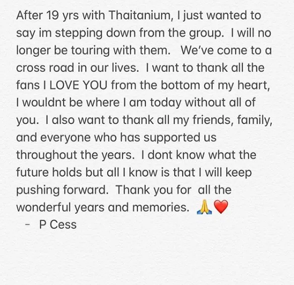 โดยเจ้าตัวได้โพสท์เป็นภาษาอังกฤษแปลได้ว่า "หลังจากที่อยู่กับวงไทเทเนียมมา 19 ปี ผมอยากบอกว่าผมได้เดินออกมาจากวงแล้ว ผมจะไม่ได้ออกทัวร์คอนเสิร์ตกับพวกเขาอีกต่อไป เรามาถึงจุดที่ต้องตัดสินใจว่าจะเอายังไงกับชีวิตของเรา