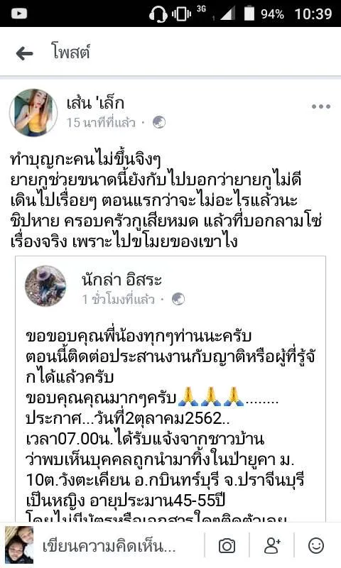 จากกรณีเฟซบุ๊ก นักล่า อิสระ ได้โพสต์ภาพหญิง ประกาศ…วันที่ 2 ตุลาคม 2562..เวลา 07.00 น.ได้รับแจ้งจากชาวบ้าน ว่าพบเห็นบุคคลถูกนำมาทิ้งในป่ายูคา ม.10ต.วังตะเคียน อ.กบินทร์บุรี จ.ปราจีนบุรี เป็นหญิง อายุประมาน45-55ปี โดยไม่มีบัตรหรือเอกสารใดๆติดตัวเลย สอบถามเบื้องต้นทราบว่าเป็นคน จ.สระแก้ว ถูกนำมาทิ้งโดยบอกว่าเขาไม่เลี้ยง แล้วไม่กลับบ้าน กลับไปจะโดนตีโดนทำร้ายร่างกายโดนล่ามโซ่ เงินคนพิการก็โดนเอาไปหมด ไม่รู้ว่าอยู่บ้านอะไรตำบลอะไรอำเภออะไรได้ดูเหมือนจะเป็นคน(พิเศษ) รู้แต่ชื่อญาติหรือบุลคลที่เคยอาศัยด้วยว่าชื่อ ตาทัน ยายเหลือ