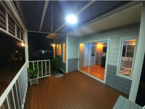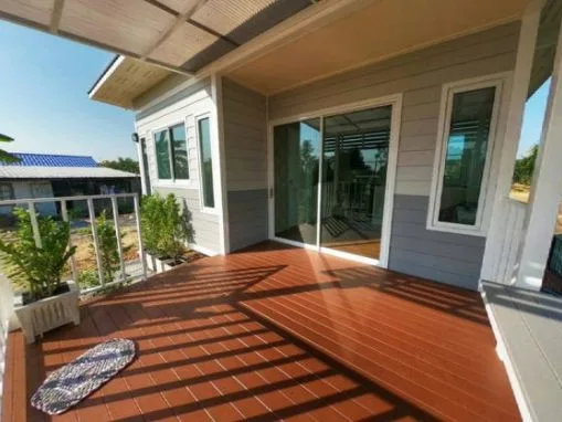 ชานด้านนอกปูพื้นด้วยหิน และเสริมแผ่นคอนกรีตลายสวยงาม และมีการเสริมกระถางต้นไม้บริเวณทางขึ้นของระเบียงทรงโมเดิร์นสวยงาม