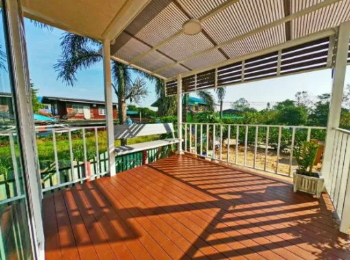 จุดเด่นของด้านหน้าบ้านคือระเบียงที่ใช้ไม้อย่างลงตัว ซึ่งบริเวณนี้นอกจากจะเป็นที่รับแขกผู้มาเยี่ยมเยือน ยังสามารถทำเป็นมุมทานข้าวภายในครอบครัวได้อีกด้วย