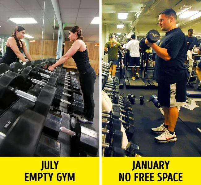 -ผู้จัดการพยายามขายสมาชิกให้มากที่สุดเสมอโดยไม่คำนึงว่ามีพื้นที่เพียงพอสำหรับทุกคนหรือไม่ โรงยิมที่ดีพยายามแก้ปัญหานี้ด้วยตารางเวลา: ถ้าคุณไปออกกำลังกายตอนเช้าคุณจะได้รับส่วนลดเพิ่มเติม นอกเหนือจากนั้นมีคนจำนวนมากในโรงยิมหลังวันหยุดคริสต์มาสและในช่วงวันหยุด